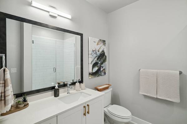-Kale Interior Design Package: Vanilla matte shaker cabinets, white shaker accent cabinets, brushed gold cabinet hardware, white polished quartz counters, deep green glazed ceramic tile backsplash, maple wood-style plank flooring, white shaker bathroom cabinets, white polished vanity, and gray marble-look porcelain bathroom flooring
