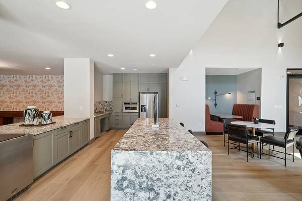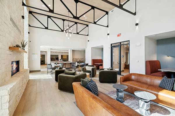 -Social lounge with fireplace, kitchen, and conversation nooks