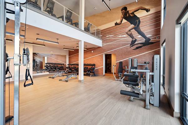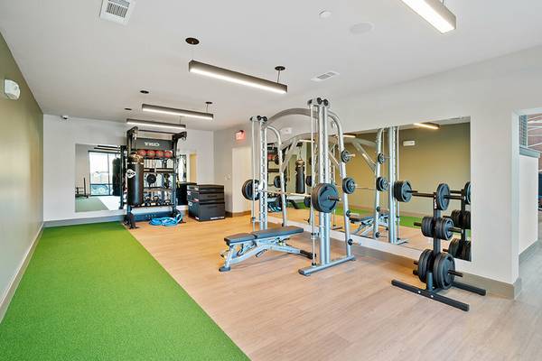 -State-of-the-art fitness center with universal gym, free weights, and dedicated yoga, spin, and aerobics areas