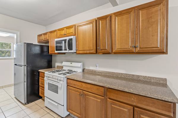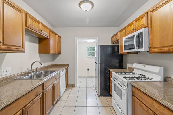 The bathroom has been updated with an elegant tile shower surround and backsplash, and has dual vanities. Each of the two spacious bedrooms features large corner windows, a ceiling fan, and a walk-in closet. This unit also has a private, fully fenced yard! Central AC and heat. In-unit laundry connections are available off the kitchen for a washer/dryer that you provide. Street Parking.