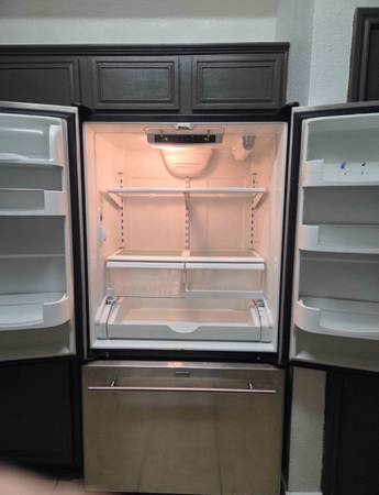 Premium 20 cu. ft. French Door refrigerator with bottom freezer. Features TriSensor climate control, temperature-controlled gourmet drawer, adjustable glass shelves with spill protection, LED lighting, internal water dispenser, automatic ice maker, glide-out freezer drawer, and produce preserver. Sleek stainless steel, counter-depth design, and professional-style handles.