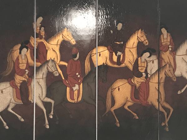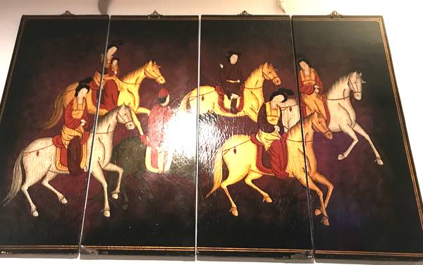 The artwork is a four-panel piece featuring a scene of elegantly dressed riders on horseback. It is a reproduction of a famous painting called Court Beauties on an Outing (丽人行图), originally attributed to the Song Dynasty artist Li Gonglin (Style Name of Zhang Xuan) (1049–1106).