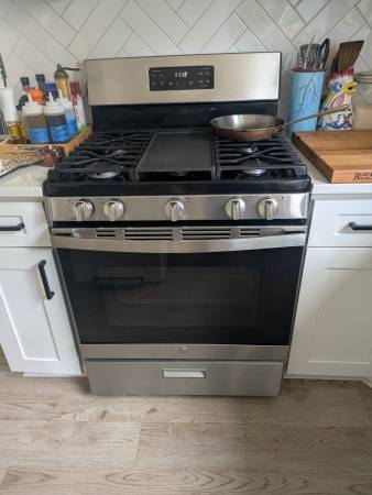 For sale is a 30" GE gas range with 5 burners and griddle. Only a few years old, works flawlessly. Great basic gas range. Oven has two racks and a broiler.