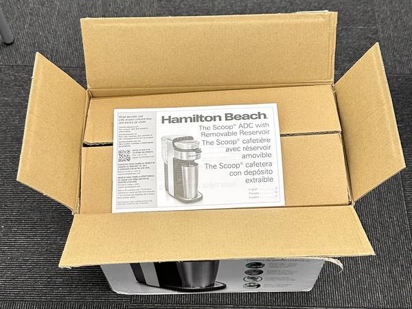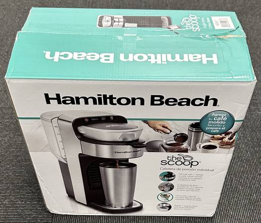 Like new Hamilton Beach The Scoop Single Serve Coffee Maker & Fast Grounds Brewer for 8-14oz. Cups, Brews in Minutes, 40oz. Removable Reservoir, Stainless Steel.