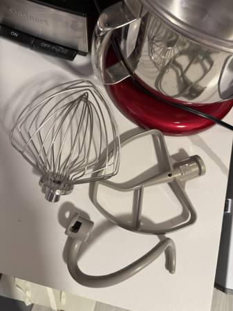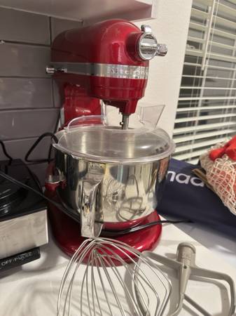 Up your holiday baking game with this Red KitchenAid 7qt Pro stand mixer. Includes pouring chute/shield, dough hook, flat beater, and stainless whip. It works great for bread dough, cookies, cakes,...