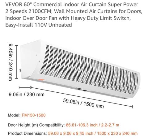 Has two levels, works well VEVOR 60" Commercial Indoor Air Curtain Super Power 2 Speeds 2100CFM, Wall Mounted Air Curtains for Doors Pickup in North Austin near Jollyville 78750, no delivery Cash or...