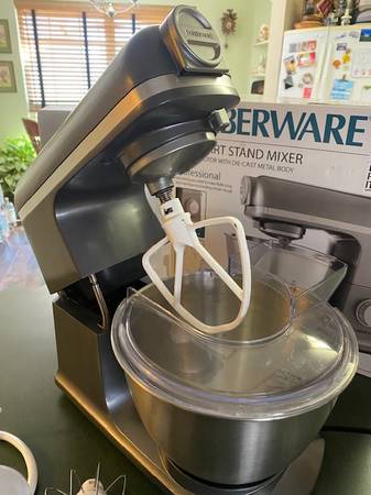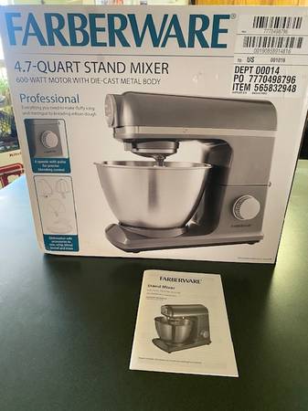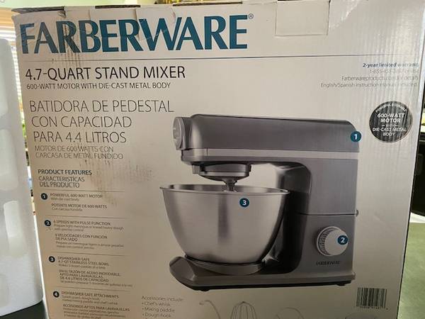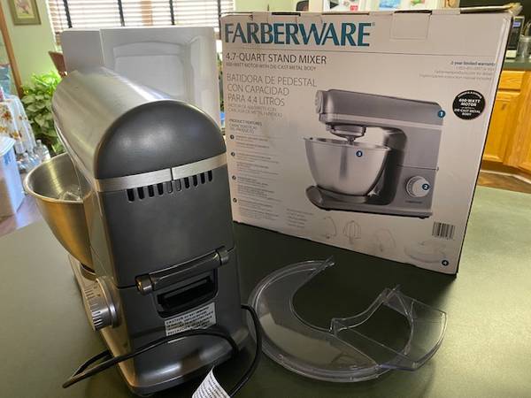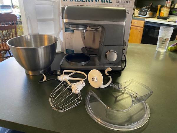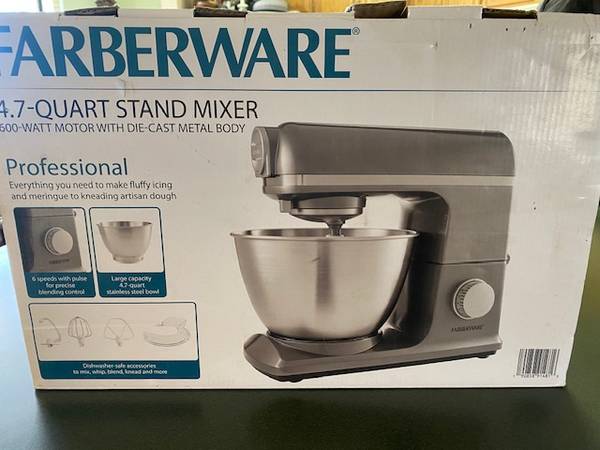 Farberware Stand Mixer, Model #SM3481RBG, 600-watt motor, 6 speed, 4.7 qt, Stainless Steel Bowl in the original box. Includes instruction manual, and dishwasher-safe parts: wire whisk, dough hook,...