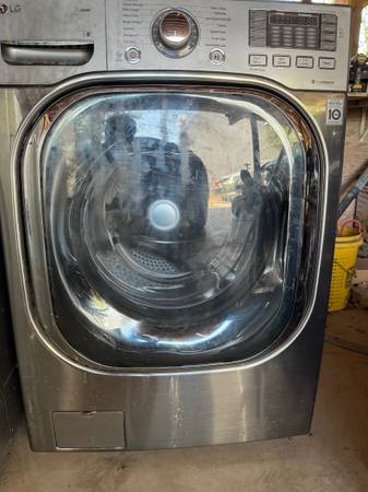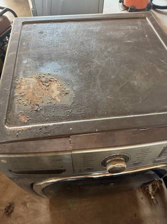 LG frontload large capacity washer. No issues other than liquid spilled on top and ate away the paint which caused some rust. Maytag 2000 dryer. Dryer had a loud squeak because of a bearing. I replaced all rollers and belt guides. I have no way to test because it is sitting in my garage and I dont have a 30amp outlet. dusty on the outside will wipe down before pickup. I cannot help load so bring a friend.