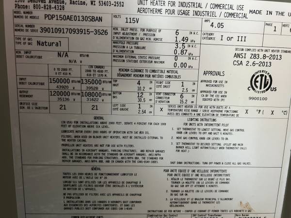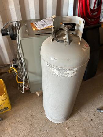 Modine propane/natural gas commercial heater. 120000 BTU full propane tank included