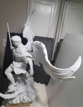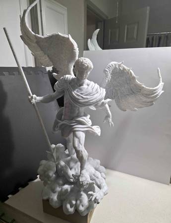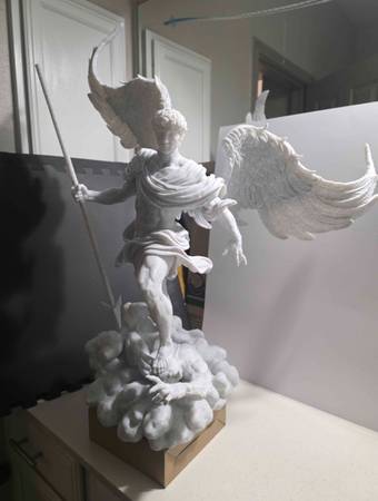 Large statue stands at 32 inches and a wingspan of 28 inches. Filled with detail and made with care. Material used is Marble PLA Plus at a high resolution and hefty build. For shipping items comes half assembled and well packed. Remaining assembly is very easy adhesive is provided. A glue accelerant can be used to speed up the process.