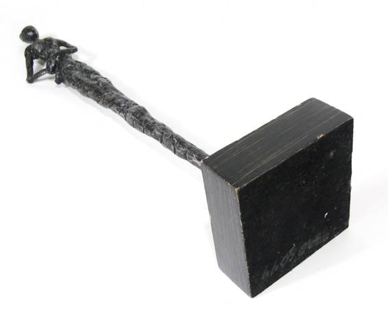 Slim abstract figure with folded hands; hollow cast aluminum in a black/silver patina. Non-magnetic; cool to touch; bright silver under tiny scratch; rings like metal. Unmarked; underside “9890 6044.”