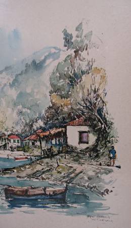 Step into the tranquility of a quaint village with this beautifully detailed watercolor by artists Aghi Ioannis and Jan Verhuls. The painting captures a serene waterfront setting, with rustic cottages nestled among lush greenery and gentle hills in the background. A lone boat rests peacefully by the shore, inviting viewers to imagine a simpler time.