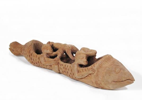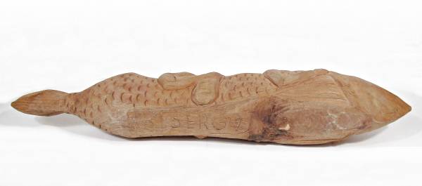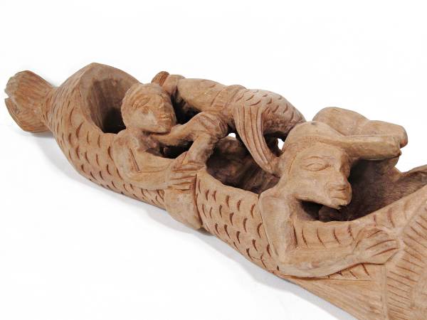This long fish-shaped canoe shows four riders and a leaping fish—all carved from one block of wood. The underside is signed SERGOJ. Natural tool marks and knots give it great texture and an honest, handmade feel. Picked up from an estate sale with a handwritten tag that read “Hand Carved Amazon Folk Art,” origin not confirmed but the spirit is there