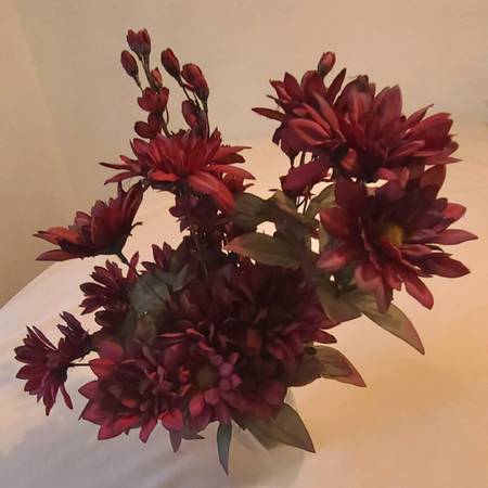 Silk flowers. 15 maroon/burgundy flower stems with green leaves. Various flower sizes, designs, and lengths. All for $10. Located in northwest Austin, Hwy 183 & Oak Knoll area.