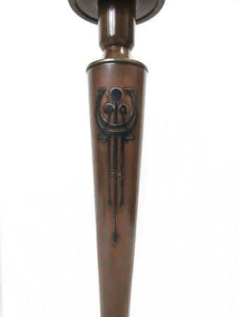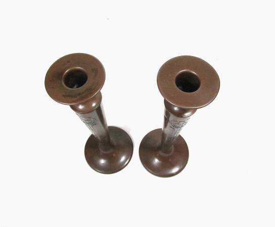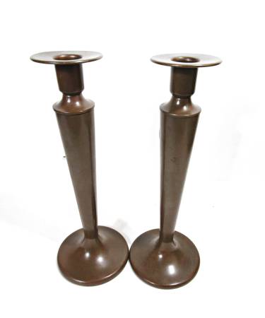 Elegant pair of Silver Crest “Sterling Decorated Bronze” candlesticks, model A1509, c. 1920s–30s. Classic tapered Arts & Crafts form with applied sterling accents and warm original patina.