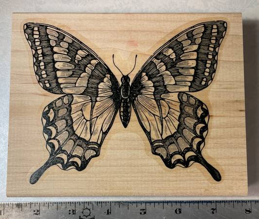 Wood-mounted, red-rubber stamp. Wood block measures 5"x6.25". Gently used, but stamps great.