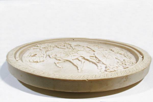 Beautifully detailed vintage high-relief carved table top in a warm antique off-white resin. The scene depicts a traditional Chinese horse-drawn carriage with driver, royal passengers, and attendants in a lush garden setting.