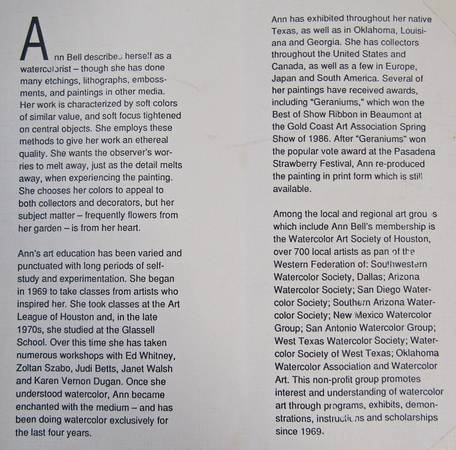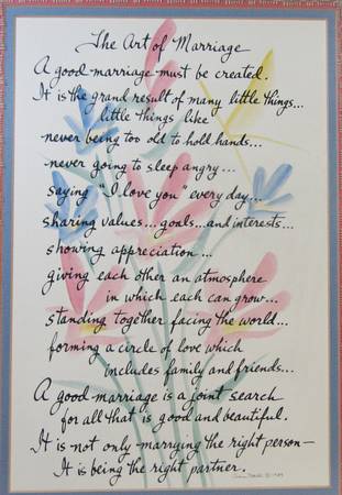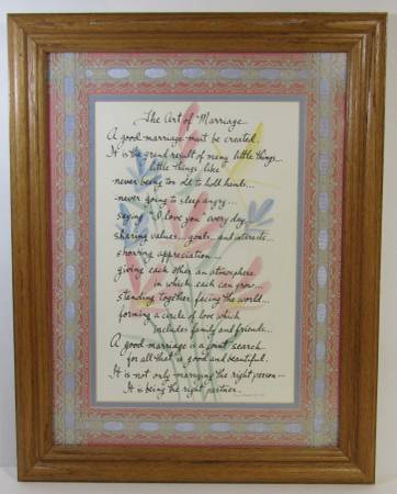 Beautifully framed 1989 calligraphy art print titled The Art of Marriage, handwritten and signed by Texas artist Ann Bell. Features soft watercolor accents and an oak wood frame with lace matting.