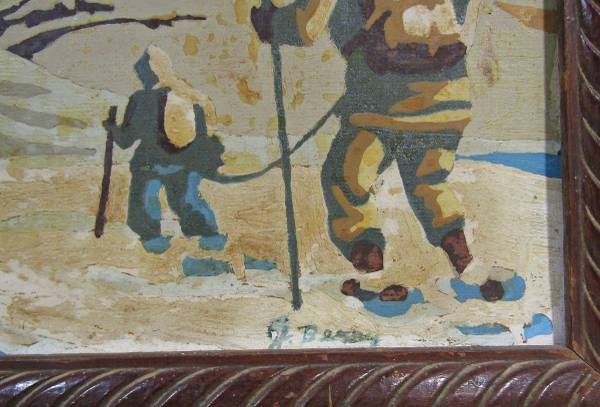 Vintage painting on wood panel featuring a striking alpine climbing scene. Two mountaineers with backpacks and poles are making their way through a snow-covered pass with a tent and rugged mountains in the background. Painted in a bold, stylized manner with strong colors and minimal detail—perfect for lodge or rustic-themed spaces.