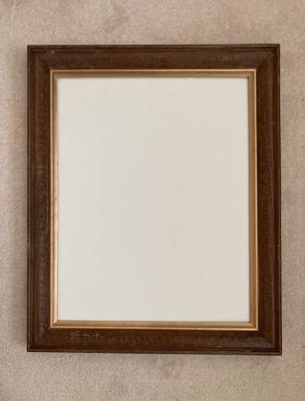 This elegant dark brown wood frame features a subtly carved, repeating design and a gold interior band. Holds a 16" x 20" canvas. This is a vintage frame from the late 1970s or early 1980s, much better made than what one finds at the hobby stores nowadays.