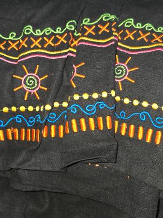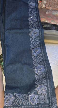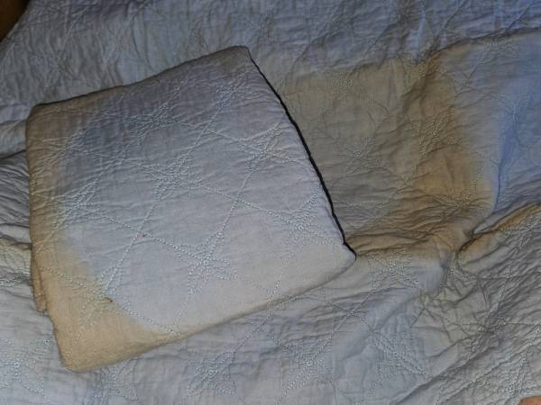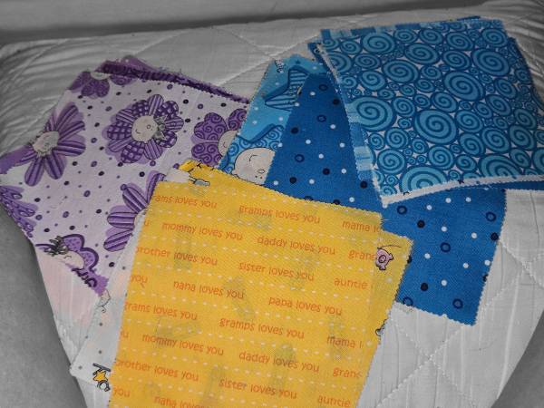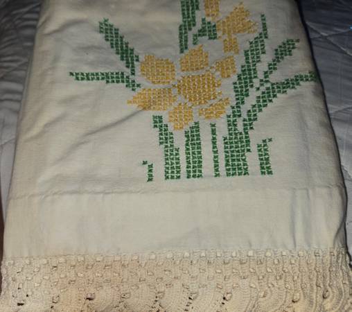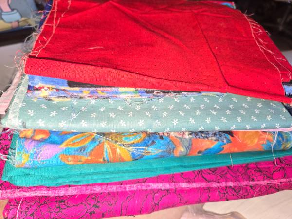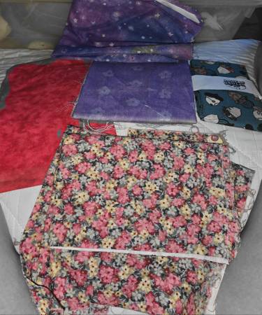 Multiple sizes & colors of material for quilting or crafting. Also, dainty handkerchiefs, decorative pillow cases, pillow shams & partially completed skirts. Some things do have dirt marks where they are folded, can possibly be cleaned though.
