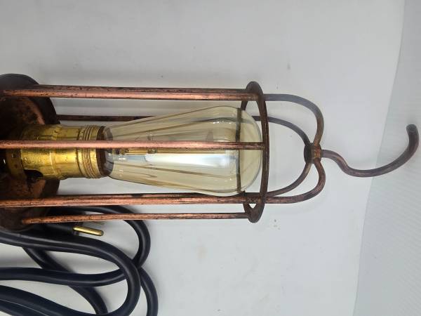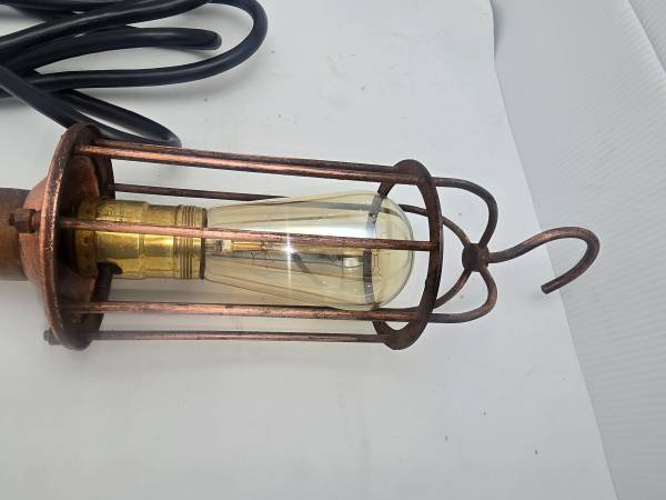 16 INCHES LONG 3.3 INCHES WIDE COPPER AND BRASS BULB CAGE. MAPLE WOOD HANDLE. MADE IN VALPARAISO, INDIANA USA ROTTING WIRE REPLACED. HAD NO INSULATION BARE WIRES. AUTOMOBILE, CAR,TRUCK,SHOP, MANCAVE.