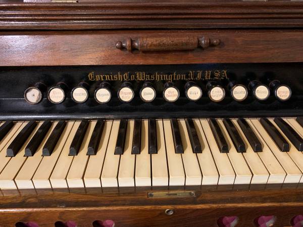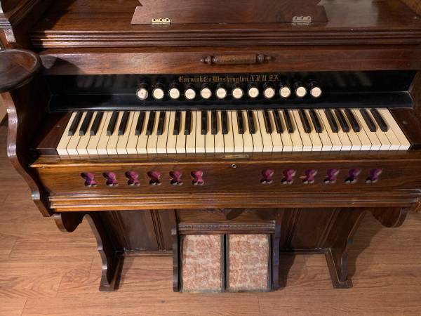 Antique pump organ - over 100 years old. Some repairs needed for all reeds to work properly. One pedal is working fine and the other needs bellows adjusted. Mahogany exterior is in excellent...