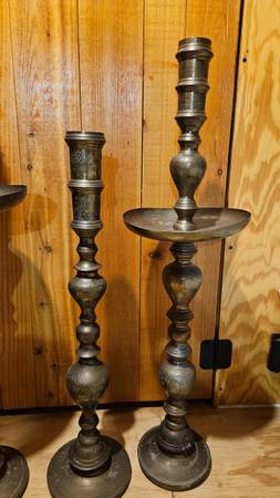 Unique Set of 3 Vintage Brass Tall Candlestick Holders – Hand-Etched