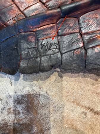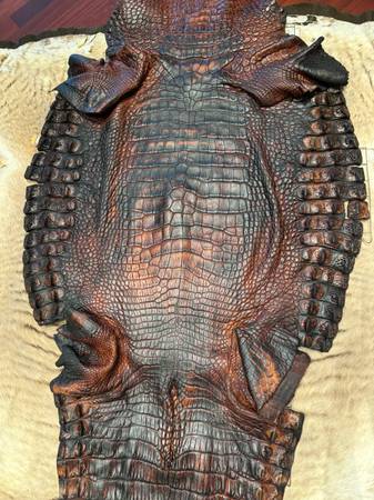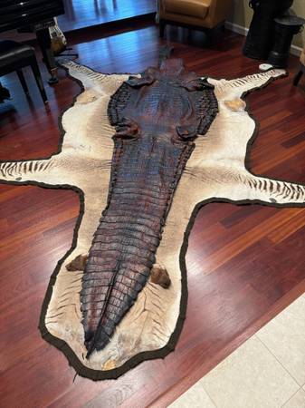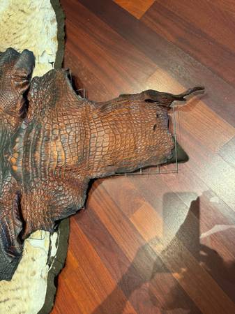 Numbered Vintage Alligator hide from Leather Bench Austin, Texas 1990. Measures 120 inches length by 39 inches (widest spot). Leather has hardened over the years and is mounted on wire backing. Great for wall mounting display. Zebra rug not for sale.