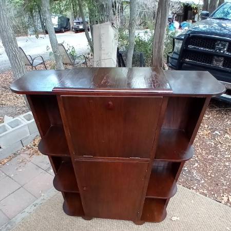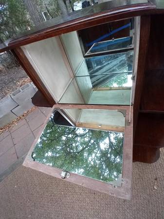Antique Bar Cabinet With Open face Bookcases on Sides Antique Bar Cabinet With Open face Bookcases and Dark wood…. In good shape. Mirror walled storage in center. Look at photo’s as they are part of...