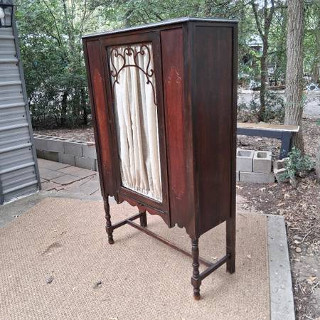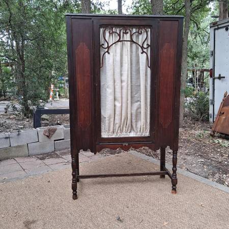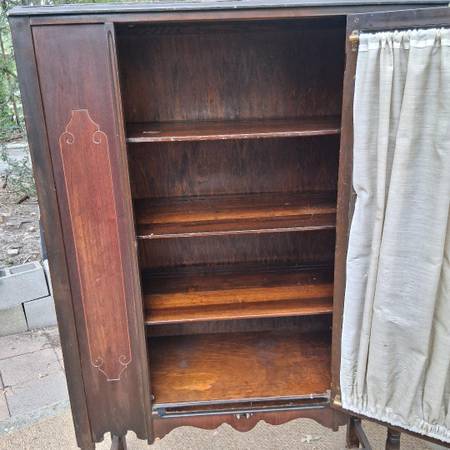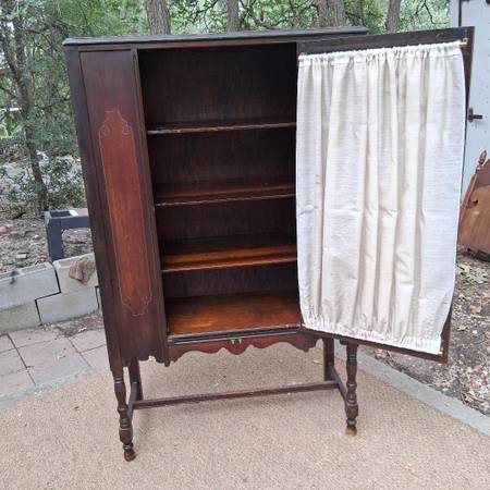 Antique Display Curio Cabinet China Hutch .. Cc 1930’s Selling this beautiful Antique China Cabinet/Linen Cabinet.. Curtain does come off of the rod.. you could add glass if you want.. does not come...