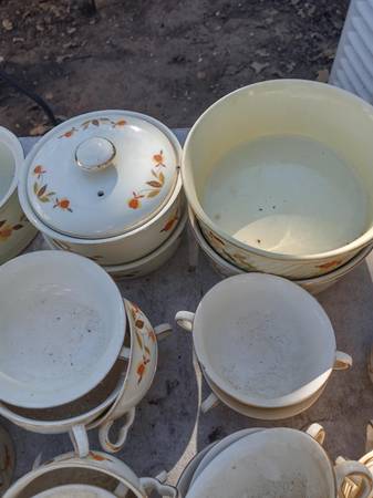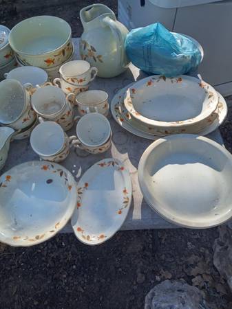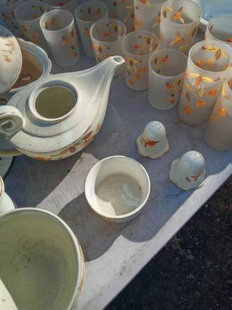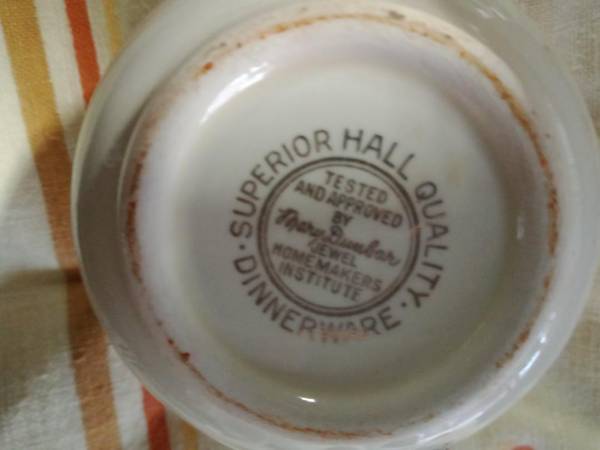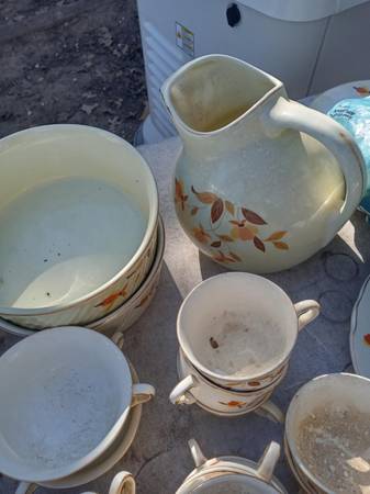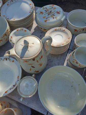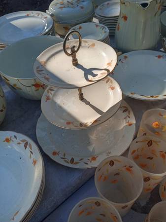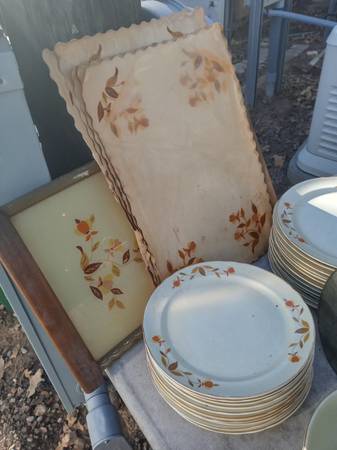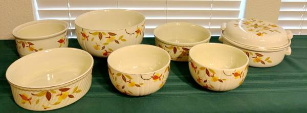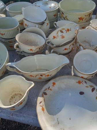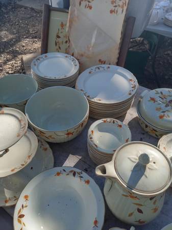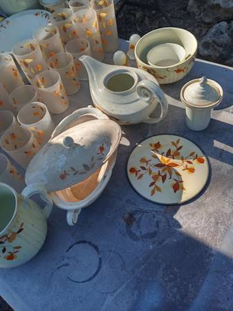 The famous Autumn Leaf pattern, one of the most-popular vintage china patterns in America. The many and varied dinnerware pieces, produced by the Hall China Company, were sold door-to-door by Jewel Tea Company salesmen for many years. .