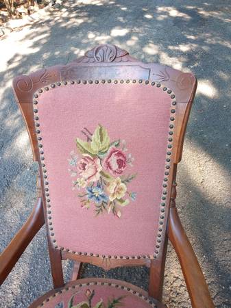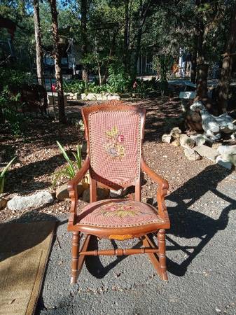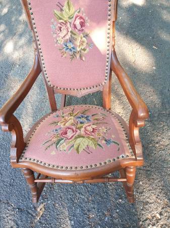 Exquisite Victorian Antique Rocking Chair With Needlepoint Tapestry Full size rocking chair.. Antique rocking chair with a floral needlepoint seat and back with nail head trim… East Lake style Very...