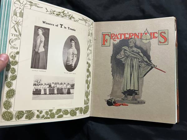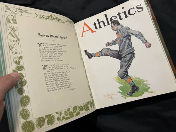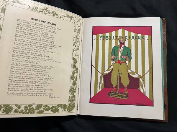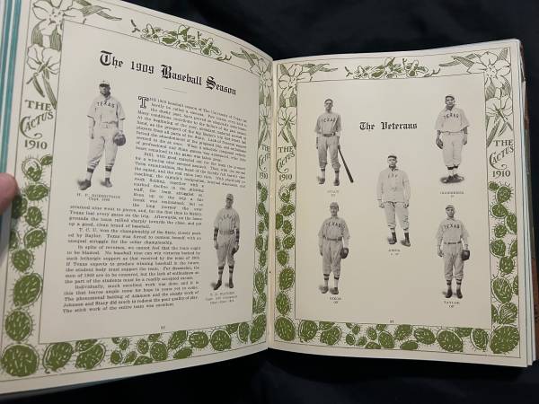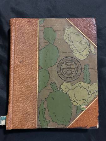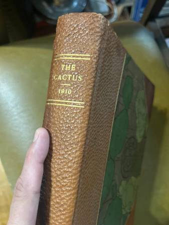 For sale is a 1910 Cactus, aka University of Texas Yearbook. That’s right it’s 115 years old Texas Longhorns Yearbook. The cover has seen better days but the pages are absolutely amazing. Amazing artwork, a glimpse into early academic life in Austin. Some of the stuff inside would be quite controversial by today’s standards. Very rare, may never see another this age again.