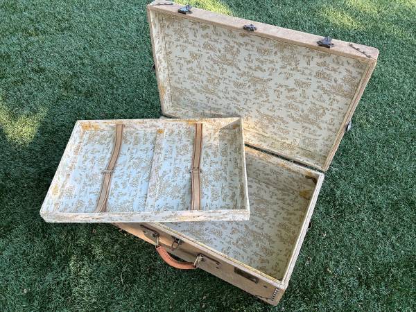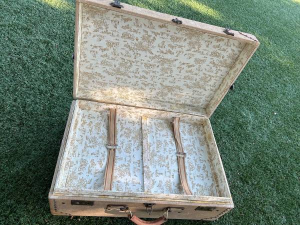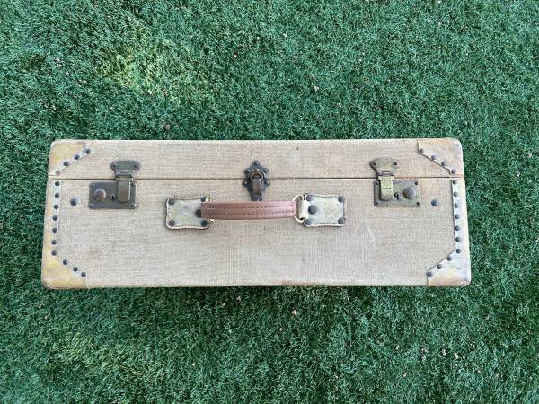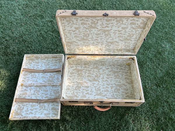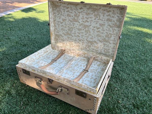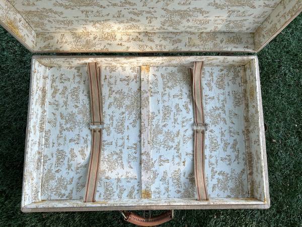 For sale is a stunning antique right at 100 year old luggage trunk with removable tray. I believe based off my research that this is a French company who made it based off the materials, hardware, and construction of the piece. It’s in overall incredible shape and a great piece for display, decor, or upcycling project. This will also clean up even better if you wish to put in some elbow grease but honestly looks stunning as is. There are several travel destination stickers from Europe on the trunk which is awesome and leads your imagination on a story. This clean classic design will go with all kinds of decor from Shabby Chic, art deco, farmhouse, early American, and so on.