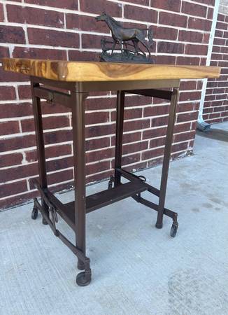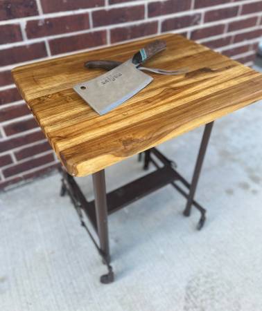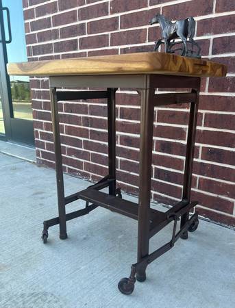 Thick heavy cutting board measuring 23.5”x 18” and is 1.5” thick. It’s mounted nicely on an antique typewriter base and is easy to move around as a mobile kitchen table or even use as just a nice upcycled antique table. Table stands 27” in height…. Sorry items staged in pics not available