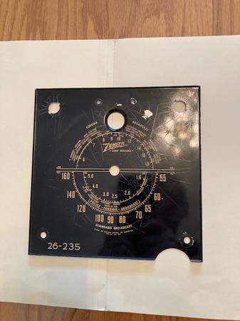 Used Zenith 5D610 (fits other models too) radio dials and new reprint (imaged thick glossy Kodak Paper) inserts. If you have a cracked paint issue on the metal dial on your radio, and need a refurb, then these are what you need. Metal Dial #'s are: 26-298, 26-235, 26-281 (281 not shown) and the reprints are 26-235 x5, 26-283 x1 (not shown).