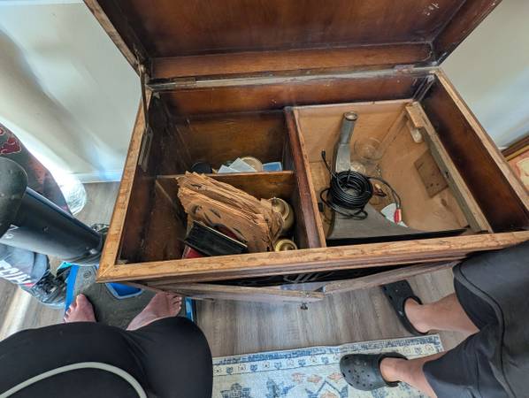 We are selling a cool antique Victrola Phonograph Cabinet. The player sits in a cabinet.There are adjustment levers for the speed of the record and also to lock the turntables. There are slots and shelves for record storage. There are some marks on the cabinet from moving and age. We did not want to touch anything. Condition is "Used".