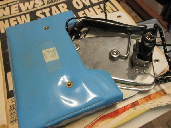 2 IRONS. CAN BUY INDIVIDUALLY. CLOTHING IRON from early in 20th century and mid-century travel iron. THE TRAVEL IRON IN THE BLUE VINYL POUCH IS $10. THE OLD SOLID METAL ONE IS $15 Cash only; no...