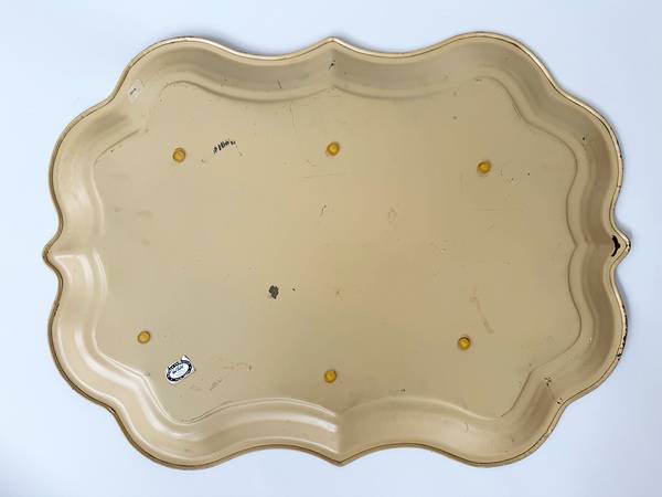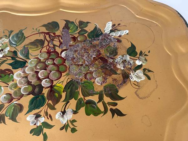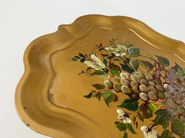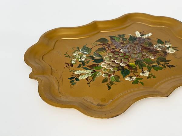 A vintage Nashco Products toleware tray for dining room or gallery wall (or both). Gold with hand-painted grapes, flowers, and vines. Ornate scalloped edge.