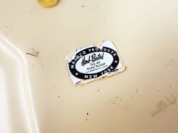 Vintage wear: scratches, water rings, spots, a little rust. In great functional shape. Flat bottom. Would make a great tray table top.