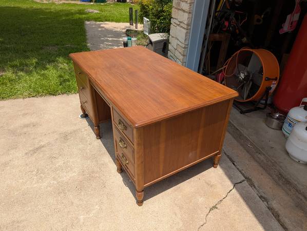 Vintage mid-century modern solid wood tanker desk with pull-out typewriter shelf. The typewriter shelf is spring-loaded to accommodate a heavy typewriter. The right drawers have built-in dividers for stationery. The top right drawer has a lock integrated with the middle pull-out drawer.