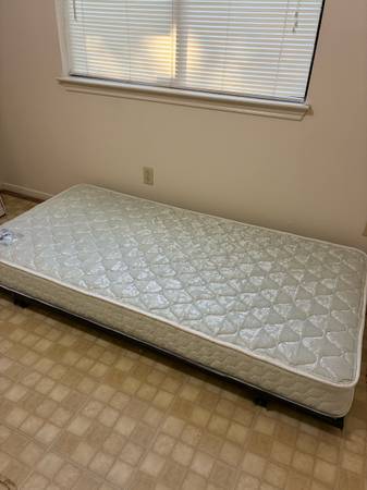 Childs twin bed with mattress and roll out bed frame. The bed can be put under a day bed. It rolls out but does not pop up. Perfect as an extra bed when needed. Asking $45
