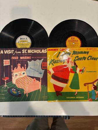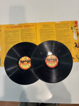 Variety of large vintage vinyl records, mostly in sleeves from 1940s and 1950s. 78 rpm. They include "A Visit From St. Nicholas (Twas the Night Before Christmas); "I saw Mommy Kissing Santa Claus" and "Thumbelina"; 2 record set of Tchaikovsky's "Sleeping Beauty"; and "Rootie Tootie Tootie (The Kewtee Bear Song)" and "The Little Bell (That Just Went Ding)" by the Honey Dreamers.