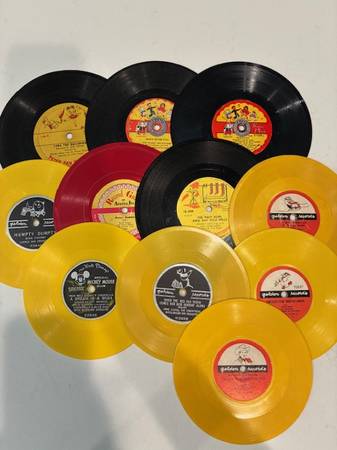 Variety of small vintage vinyl records, most in no sleeve, but a few are. Most from the 1950s. Range in size from 6" to 7" with small hole for spindle. Those with no sleeve include Walt Disney's Official Mickey Mouse Club "A Dream is a Wish Your Heart Makes"; "Mistress Mary" and "Humpty Dumpty" by Bing Crosby Chorus and Orchestra; "Peter Rabbit"; "Pinocchio"; "March of the Toys"; "Toyland"; "Tina the Ballerina"; "When the Red Red Robin Comes Bob Bob Bobbin' Along"; Roy Rogers & Dale Evans "The Lord is Counting on You"; "Frosty The Snowman"; "The Little Stowaway on Santa's Sleigh"; "It Came upon a Midnight Clear" and "The First Noel Ring out the Bells" by Johnny Kay with The Caroleers. Those in sleeves from Peter Pan Records include "Twas The Night Before Christmas"; "In a Little Red School House"; and "The Gingerbread Man."