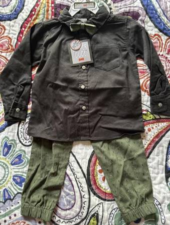 - DAPPER DUDE 3pc Black Dress Shirt & Green Bear Jogger Pants w Bow Tie Set, Boys Sz 2T - $15