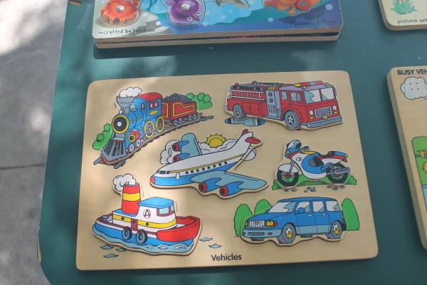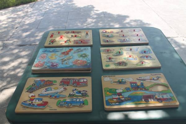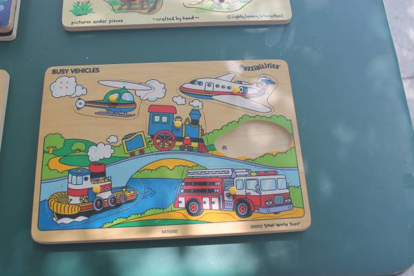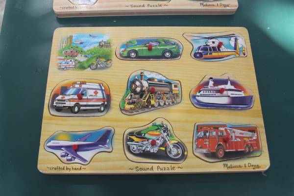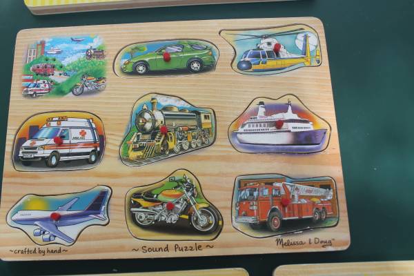Doug And Melissa wood puzzles: No batteries included. Sound puzzles are $8.00 each, all others $5.00 each. Sound puzzles are of animals and vehicles. Others are sea animals, firemen, construction...