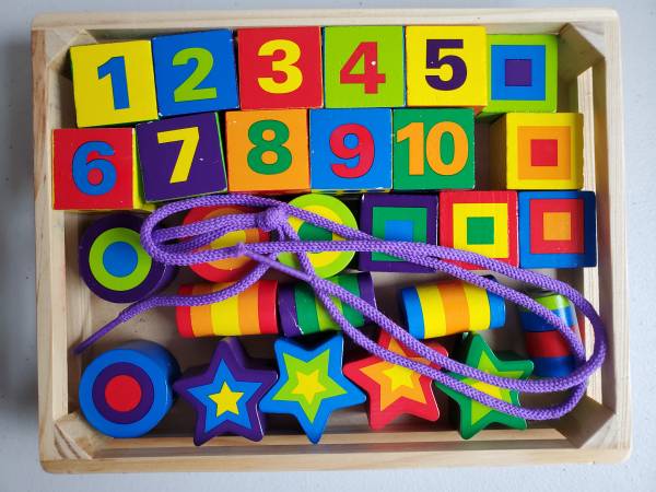 Animal lacing, Number/color lacing, Shapes, Number, Letter, Construction vehicle, Dinos, Animal jigsaw, Train, Plane, Ship, Car.