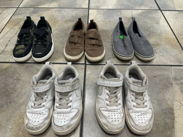 Boys shoes in size 11. Good condition. Includes: Camouflage- $3 ( Like new) Brown- $2 Grey- $2 Both White- $1 each