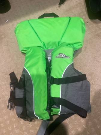 Kids life jackets. 2 styles Qty-1 neoprene zip up swim vest, for swim assistance Qty-2 toddler arm band floaters USCG Approved 30-55lbs. Qty-1 vest USCG Approved. 30-50lbs. All in good condition $10...